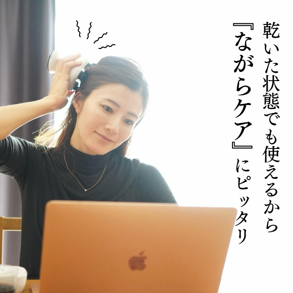 電気刺激を使わない時は乾いた状態でもOK。私は3人の幼児を育てていてお風呂時間は慌ただしいので、日中や夜の自分時間の時の“ながらケア”に多用しています。乾いた頭に当てると、頭皮をつまみ上げられながら揉まれているような感覚。ちょっと気になるときはパソコンを叩きながら頭や肩周りに当てています。また、脚に使うのも◎。この時はミストをかけて電気刺激を効かせています。寝る前に足首からスネを揉み上げてリフレッシュ!週末の夜の癒し時間になっています。