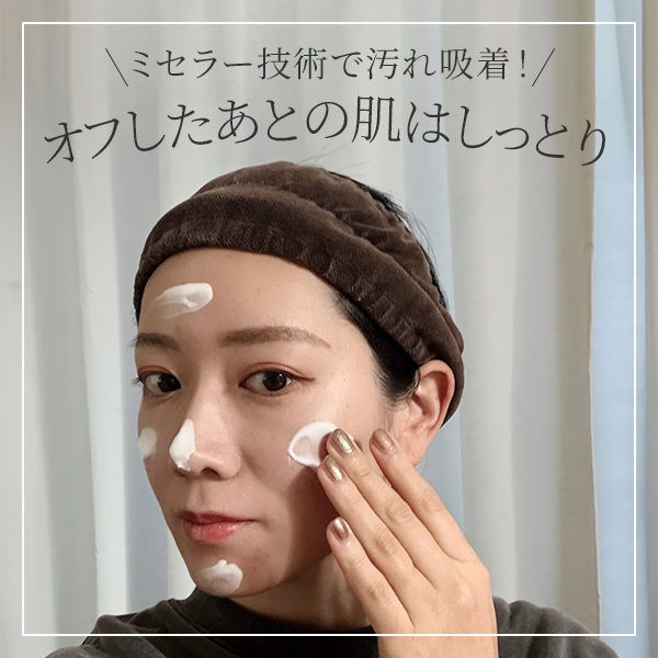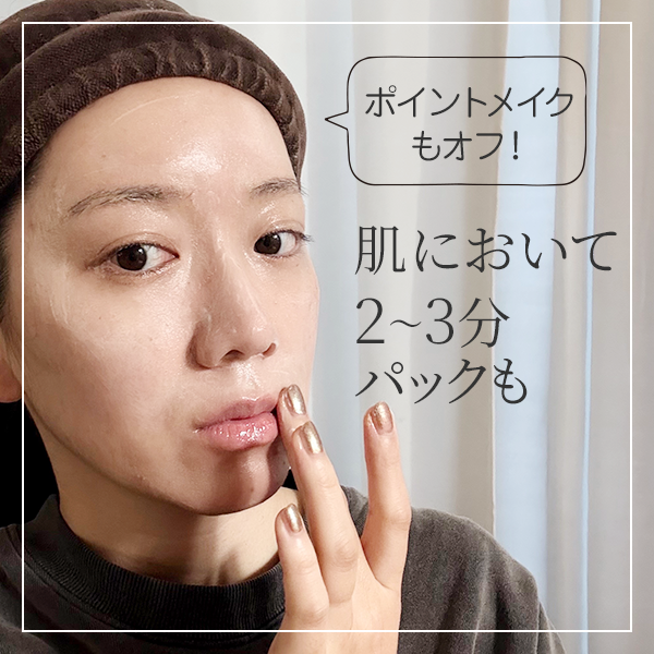 筆者の場合、アイメイクやリップもまったく問題なくオフすることができました。何より肌になじませるととても気持ちがよく、美容成分が99.2%(水・乳化洗浄成分を含む)なので、2~3分おいてパックするのもおすすめ!