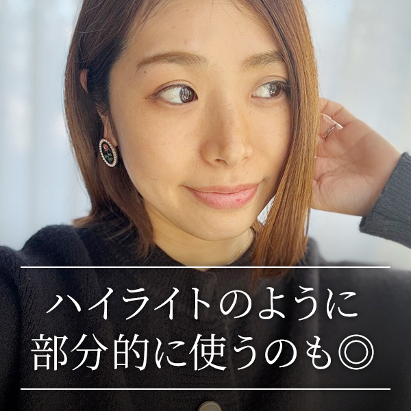 「パーフェクトグロウエッセンス」のもう一つの魅力は、色々な使い方ができること。下地としてファンデの下に仕込めばナチュラルに輝く血色感のあるツヤ肌に、肌がくすんできたなと思ったらメイクの上から少しプラスするのも良し、鼻や頬の高い部分にハイライトのように部分的に使うこともできます。