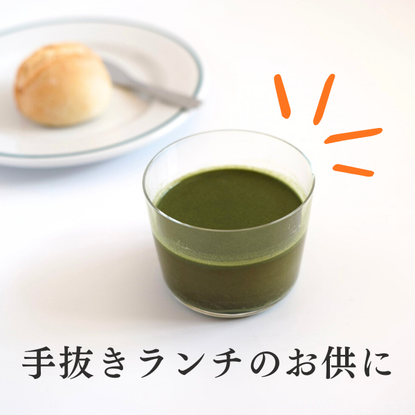 味はクセの少ない薄めの抹茶のような風味。冷たい水にも溶けやすいので、シェイカーも不要です。 自分一人の簡単なランチの時も、これを一杯足すのがお決まりで、心強い味方になっています。