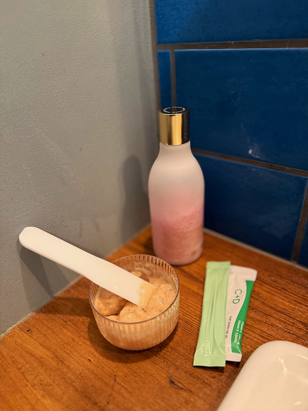 ライブ前の鉄板美活セット。炭酸パック、入浴剤、乳酸菌&ビタミンC&Dのサプリメント。