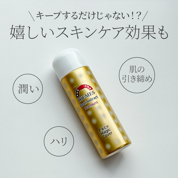 「フェイスマジックカバー パール プレミアム」は、メイクの上に成分がぴったりフィットし、コーティングすることで皮脂や摩擦によるメイク崩れを防止します。ファンデーションや日焼け止めなどが落ちないようカバーしてくれるだけでなく、アイブロウやアイシャドウ、チークなどの発色もキープしてくれます。