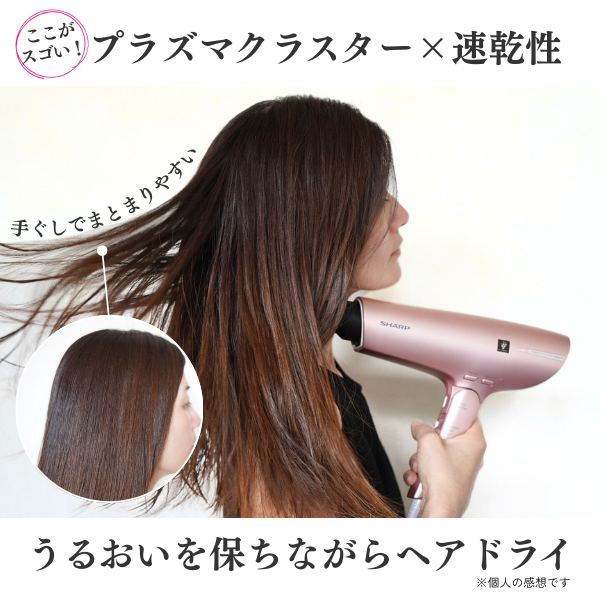 シャープ独自の「プラズマクラスター」技術は、空気中の水分子からプラスとマイナスのイオンを発生させる仕組み。その風を髪に当てることで潤いを保ち、キューティクルを整えたり、静電気を抑える働きがあるとされています。また、カラーリングをした髪や日常の扱いやすさにも配慮した設計で、乾かしながら髪の手触りやまとまりに意識を向けやすいのが特徴です(※公式試験条件に基づく)