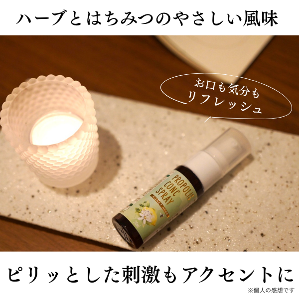 シュッとひと吹きすると、爽やかな風味とやさしい甘みが口の中に広がり、お口が潤うように感じます。プロポリス特有のピリッとした刺激も心地よく、お口を潤わせたいときや、季節の変わり目の健康維持のために取り入れやすい印象です。