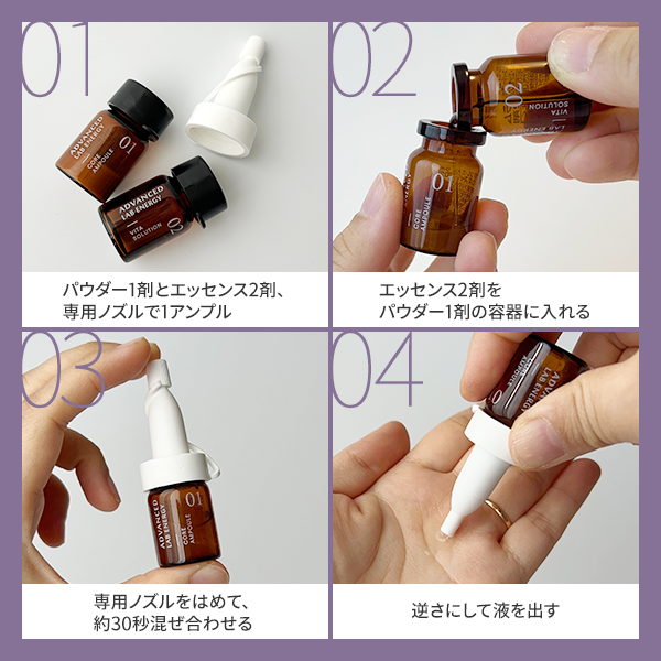 エッセンス2剤をパウダー1剤の容器に入れて、専用ノズルを「カチッ」っとはめて約30秒ほど混ぜ合わせてアンプル完成。