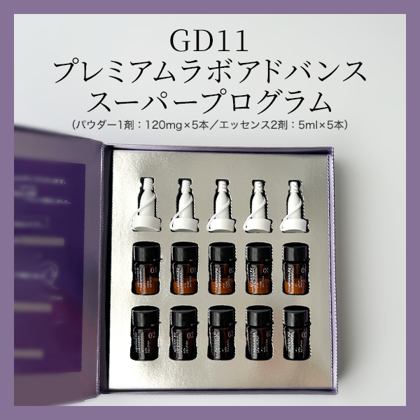 「GD11 プレミアム ラボ アドバンス スーパー プログラム(美容液)」は、パウダー1剤とエッセンス2剤を自身で混ぜて使用する美容液。