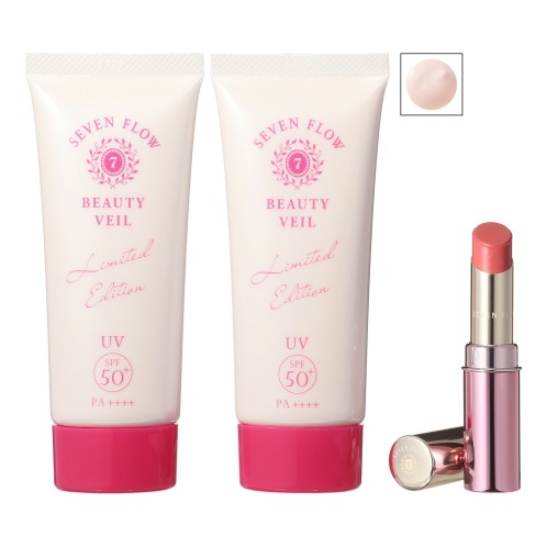スプーン美容をはじめ、雑誌やTVで話題の美容研究家、小林ひろ美さんがプロデュースする<セブン フロー>より、こだわりの美容成分を配合し、スキンケアを行いながら、メイク効果で色ムラや毛穴を自然にカバーし、明るく艶やかなお肌に仕上げる「ビューティ ヴェール(日中用美容液・化粧下地)」増量サイズ×2本と、唇のトリートメント、口紅、リップグロスの3役を果たすスティックタイプの「グロスルージュ“ジューシーコーラル”」のセットです。