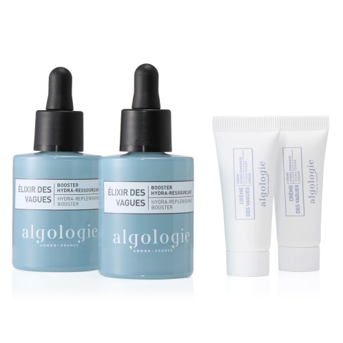 <アルゴロジー>より、お肌に潤いを与えて保護する濃密な美容液×2、お肌に潤いを与えながらもベタつきにくく、ふんわりと軽いテクスチャーのクリーム・5gサイズ×2のセットです。