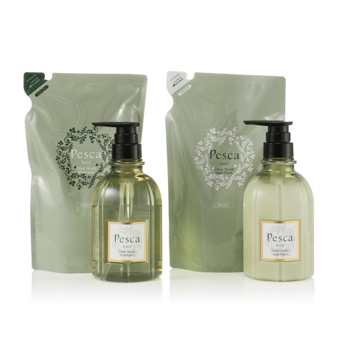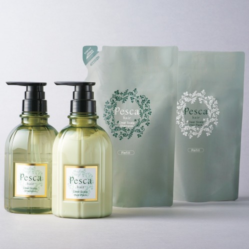 エステサロン“ペスカ”発のオリジナルコスメ<ペスカ>より、エステサロン“ペスカ”のサロンケアをもとに、長年の経験とこだわりのスキンケア発想で開発したシャンプー500mlとそのレフィル(詰め替え用)450ml、ヘアパック500mlとそのレフィル(詰め替え用)450mlのセットです。