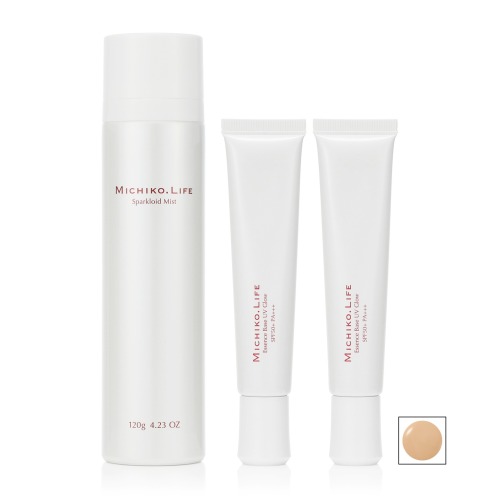 <ミチコドットライフ>より、透明感のあるツヤ肌を演出するSPF50+、PA+++の化粧下地×2、角質層の隅々まで潤いを与え、キメの整ったお肌へ導くミスト状化粧水のセットです。
