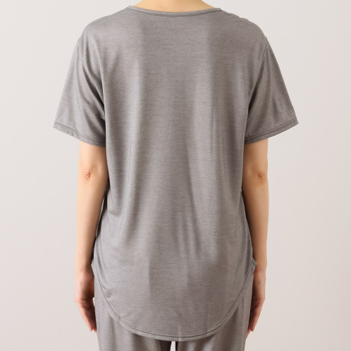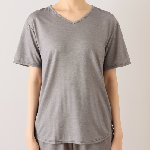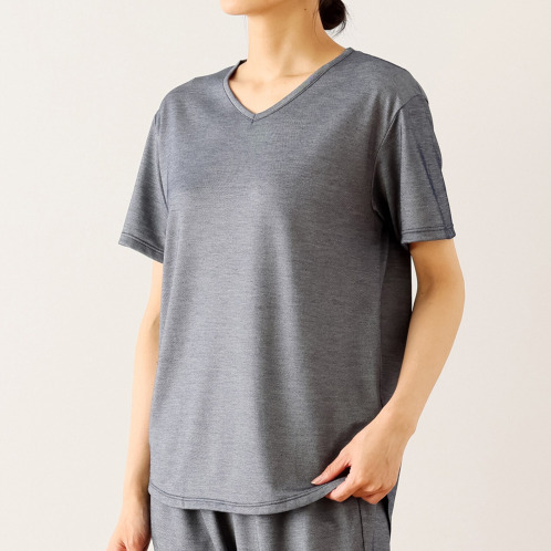 首元がすっきり見えるVネックで、女性らしく、リラックスした雰囲気で着用できるシルエットです。