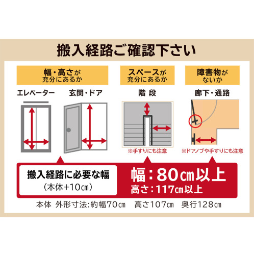 ・本品の搬入に必要な幅は約80cm。(本体幅約70cm+養生10cm)