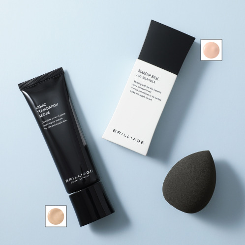 <ブリリアージュ>より、軽やかに伸びるテクスチャーでサーッとなじんで、素肌の上に薄く透明なフィルムベールを形成したように毛穴や乱れたキメなどのお肌の凹凸をカバーしてつるりとなめらかなお肌に整えるSPF25、PA++のUV化粧下地、メイク効果でカバーしながら、スキンケアした後のようなツヤ肌を演出するSPF20、PA++のリキッドファンデーション、ファンデーションを薄く伸ばしてツヤ肌に仕上げる、フワフワとした弾力の卵型スポンジのセットです。