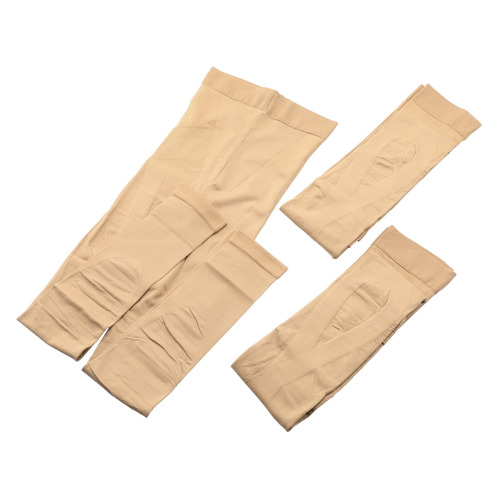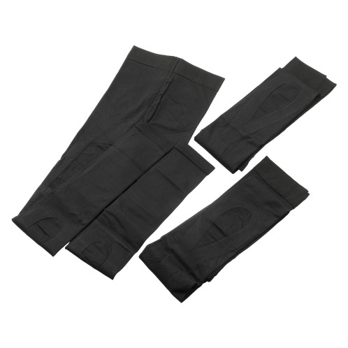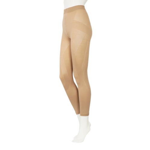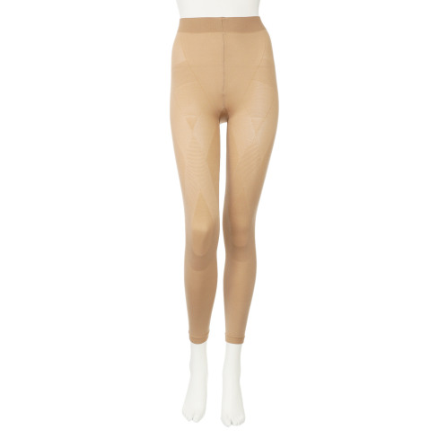 スカートやチュニックにも合わせやすいよう、すね周りやふくらはぎにはテーピングラインをほどこさず、段階着圧のみで仕上げました。