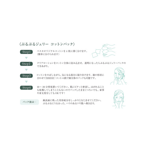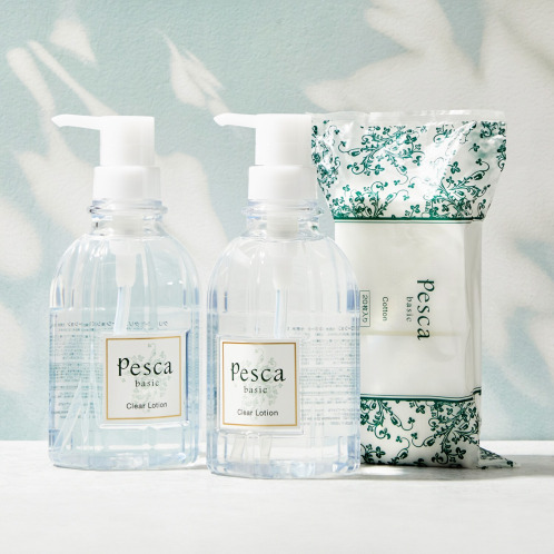 <ペスカ>より、これ1本で保湿の化粧水、マッサージ、ペスカ洗顔、コットンパックとさまざまな用途で使える保湿化粧水・ペスカ洗顔のビッグサイズ(500ml)×2、コットン20枚入りのセットです。
