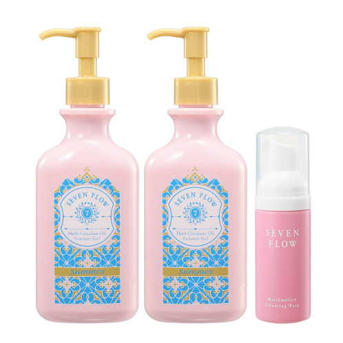 <セブン フロー>より、汗ばむ季節にも肌なじみよく、ベタつかずに心地よく使えるテクスチャーにこだわった、 お肌を柔らげて、ハリ、潤いを与えるジェルオイル美容液×2、お肌に潤いを与えるロバミルク(ロバ乳)を配合した 、スキンケア発想の洗顔料・メイク落としの45mlサイズのセットです。