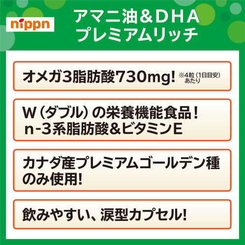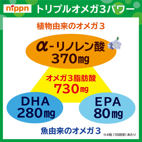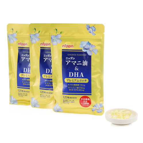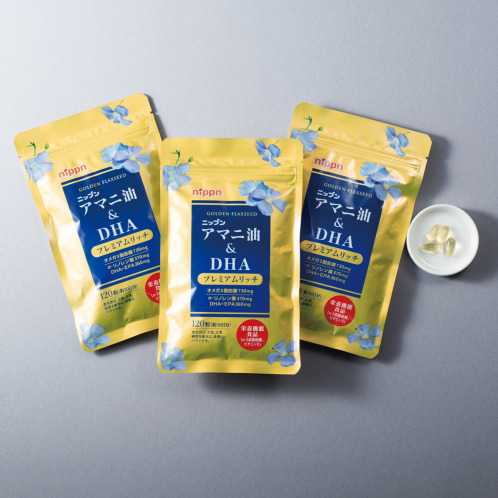 <ニップン>より、植物由来のオメガ3(α-リノレン酸)、魚由来のオメガ3(DHA)、魚由来のオメガ3(EPA)の“トリプルオメガ3”(n-3系脂肪酸)を一度に手軽に摂取することができるサプリメント「アマニ油(アマニオイル)&DHA プレミアムリッチ」のご紹介です。