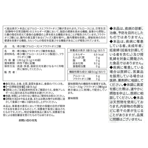 純度98%以上のアルロース(希少糖)と純度95%以上のフラクトオリゴ糖を使用、おいしいのに甘さは砂糖より抑えめ、砂糖の代用甘味料として使える機能性表示食品「希少糖&フラクトオリゴ糖」です。