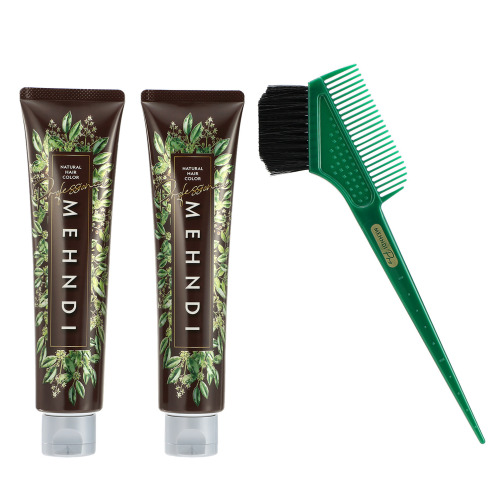 <メヘンディ>より、髪にハリコシを与えるインド産のヘンナと、原料にインド産をはじめとするヘナを使用したヘンナ葉エキスの2種類のヘナを配合、頭皮を保湿し健やかに保ち、髪を補修し、ツヤ色に染める染毛料×2、刷毛とコーム一体型のカラーリングコームブラシ、ヘアキャップ、イヤーキャップ(2枚1組)、ビニールグローブ(2枚1組)のセットです。