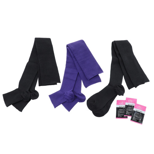 リオッサ 足首キュッ! ひざ裏ゆったりの快適着圧 寝るときソックスV ブラック&バイオレット 3足セット シルキーラップ パウチ付