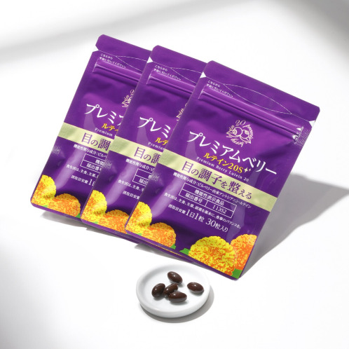 ビルベリー由来アントシアニン40mg(1粒あたり)、ルテイン20mg(1粒あたり)というダブルの機能性関与成分を配合した、機能性表示食品「プレミアムベリールテイン20S」です。