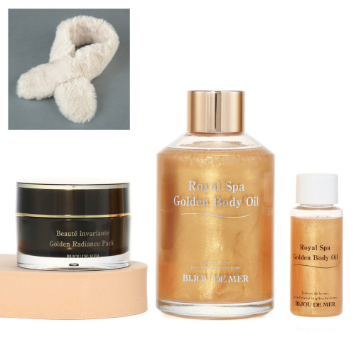 <ビジュー ドゥ メール>より、19種類の美容成分&8種の植物由来オイルを配合、お肌を引き締め、ゴージャスなハリツヤ肌へ導くボディオイル190mlと28mlサイズ、ハリツヤ肌へ導く美容パック20gサイズ、マフラーのセットです。
