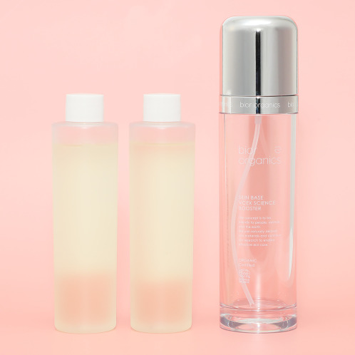 <ビオール オーガニクス>より、美容成分を100%(水を含む)配合し、角質層の隅々まで潤いを与えて、お肌を柔らかくし整える化粧水のレフィル×2と専用ボトルのセットです。