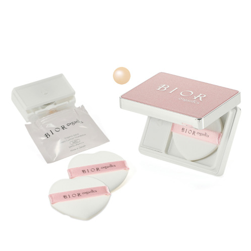 <ビオール オーガニクス>より、独自の“チェンジパウダー感”機能によって、お肌にのせるとパウダーのような質感に変化しリキッドファンデーションのしっとり感とパウダーのサラサラ仕上げを併せ持ったような、艶やかで軽やか、そして若々しい印象で透明感のあるお肌を演出するファンデーションのレフィル(詰替え用)×2、コンパクトケース、ファンデーションに付属のパフとは別にパフのセットです。