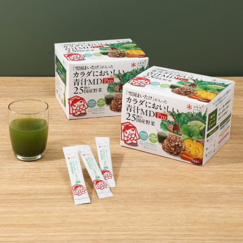 お客様にさまざまな形できのこの良さを伝える、きのこの総合メーカー<ユキグニファクトリー> が作った、雪国まいたけと25種類の国産野菜を配合した「雪国まいたけが入った カラダにおいしい青汁MDPro 25種の国産野菜」です。