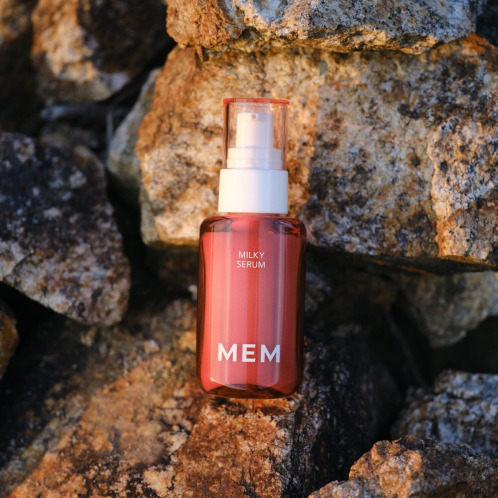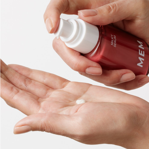<MEM>より、水溶性美容成分と油溶性美容成分をバランスよく融合、コクがあるのにみずみずしい使い心地のミルク状の美容液です。