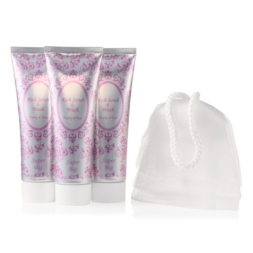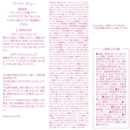 <パーリーデュー>より、角質ケア機能、洗浄機能、トリートメント機能の全身美容ケアができる、多機能ボディ用スクラブ洗浄料の2.5倍サイズ(250g)×3、ボディ用泡立てネットのセットです。