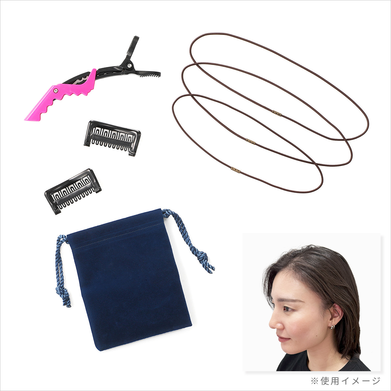 ・特製クリップ×2、専用ゴムバンド×3本(ロング、ミディアム、ショート 各1本)、ポーチ、髪留め