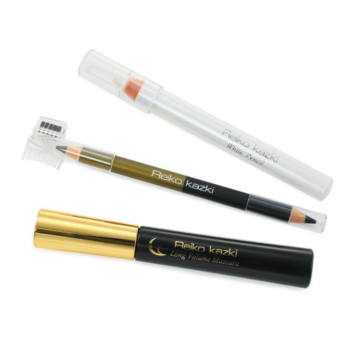 <かづきれいこ>より、両端にオリーブブラウンのアイブロウとブラックのアイライナーがセットされて1本になったアイブロウ&アイライナー、下まぶたのまつ毛の生え際にラインを入れると、黒目とのコントラストで白目に透明感が増して見え、キラキラとした印象の瞳を演出するホワイトアイライナー、傷んだまつ毛をトリートメントケアしながら、メイクアップ効果で長くボリュームアップ、繊維が一本一本のまつ毛を太く長く見せ、目元を華やかな印象に演出するにじみにくいフィルムタイプのマスカラのセットです。