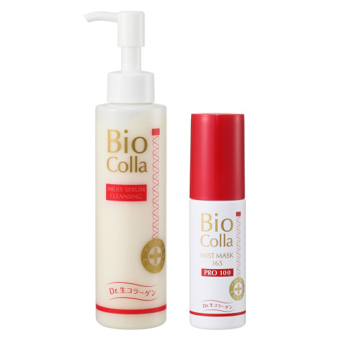 <ビオコラ>より、水の代わりにコメ発酵液を使用したトリプルSNC製法で製造した2つのコラーゲン原料(生コラーゲン(水溶性コラーゲン(ウシ))(非加熱25度以下)、メドコラミドル(アテロコラーゲン(ウシ)))を配合した、お肌にハリを与え、キメを整えるミスト状美容マスクと、メイクや毛穴の奥の汚れをすっきり落としながら、お肌に潤いとハリを与えるクレンジング・洗顔料です。
