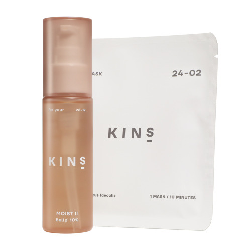 <KINS>より、当ブランド独自成分をはじめ、こだわりの美容成分が角質層の隅々まで浸透し、ハリツヤ潤い肌へ導く美容液と、こだわりの菌由来成分が角質層の隅々まで潤いを与え、お肌を整え、ハリツヤのある柔らかなお肌に導く美容液マスク1枚のセットです。