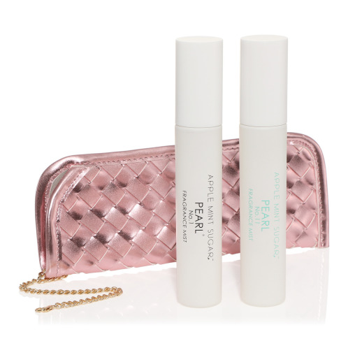 <アップルミントシュガー>より、ボディーやヘアにスプレーするだけでさらっと香りをまとえる、フレグランスミストとしても楽しめる、上質で気品あるソーピー系(石けん)の香りの「フレグランスミスト パール No.1(ボディローション)」、上品な甘さとみずみずしい清潔感のあるシャンプーの香りの「フレグランスミスト パール No.11(ボディローション)」、ポーチのセットです。