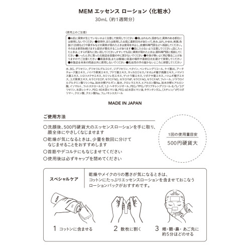 ・同梱文書「MEM エッセンス ローション 使用方法(コットンパック含む)」