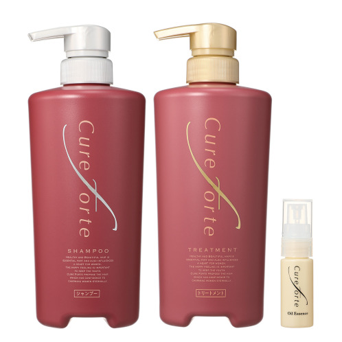 <キュアフォルテ>より、髪を補修しながら頭皮の汚れと髪を洗浄し、ハリコシツヤ髪へ導くシャンプーの600mlサイズ、髪を補修し、しなやかでハリコシツヤのある髪へ導くダメージケアトリートメントの600gサイズ、シャンプー後、軽くタオルドライした髪に適量を塗布し、髪に潤いとツヤを与えるアウトバスとして使える、洗い流さないヘアオイル美容液の10mlサイズのセットです。