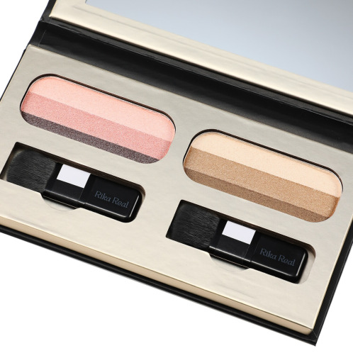 <リカリアル>より、ひと塗り1秒でプロのようなグラデーションが出来る新感覚のアイシャドウパレット(色: スイートピンク、クラシックゴールド)です。