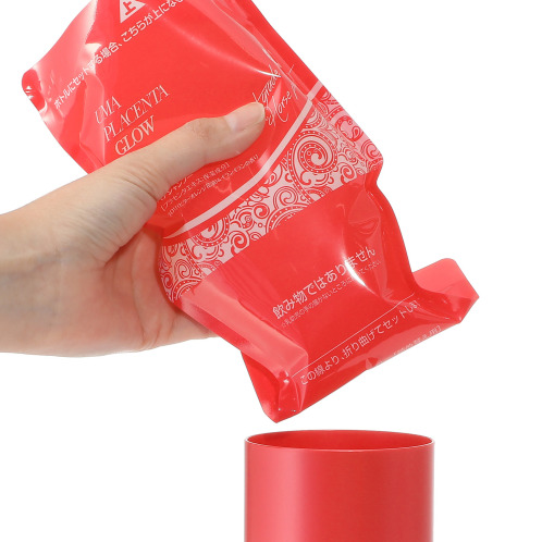 1.外容器を開けて、パウチ上部を線の部分で折り曲げ、パウチの底の部分を上にして、