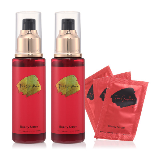 <ファイングラフェン>より、注目の美容成分であるグラフェンをはじめ、こだわりの美容成分を27種類配合した、ハリツヤ潤い肌へ導く保湿美容液100g×2と、2gサイズ×3のセットです。