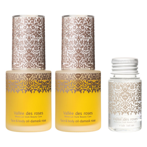 の“ヴァレ ド ローズ”シリーズより、アルガンオイル(アルガニアスピノサ核油)、サボテン種子オイル(オプンチアフィクスインジカ種子油)を配合し、潤いハリ肌へ導くフェイス&ボディオイル40ml×2、お肌を保湿するアルガンオイル(アルガニアスピノサ核油)と、サボテン種子オイル(オプンチアフィクスインジカ種子油)、お肌に潤いを与えて、お肌を整えるバラ水(ダマスクバラ花水)を配合した美容水・30mlサイズのセットです。
