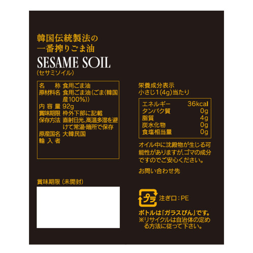 韓国伝統圧搾の 一番搾りごま油 いつものお食事にひとかけ “セサミソイル” 2本セット