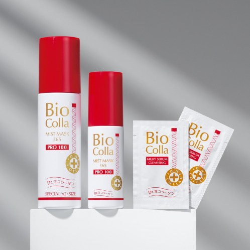 <ビオコラ>より、水の代わりにコメ発酵液を使用したトリプルSNC製法で製造した2つのコラーゲン原料(生コラーゲン(水溶性コラーゲン(ウシ))(非加熱25度以下)、メドコラミドル(アテロコラーゲン(ウシ)))を配合した、お肌にハリを与え、キメを整えるミスト状美容マスク50ml、2倍サイズ(100ml)、メイクや毛穴の奥の汚れをすっきり落としながら、お肌に潤いとハリを与えるクレンジング・洗顔料の2mlサイズ×2のセットです。