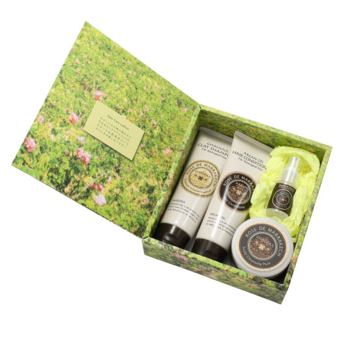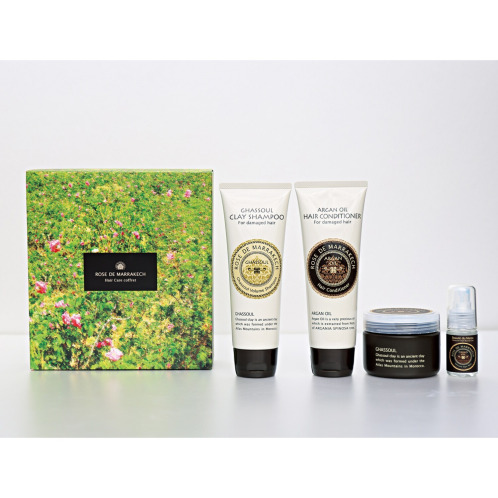 <ローズ・ド・マラケシュ>より、植物由来成分γ-ドコサラクトンを配合し、髪にハリコシを与えるシャンプーと、ヘアコンディショナー、モロッコ産のガスール(モロッコ溶岩クレイ)を配合し、毎日のシャンプーでは落としきれない頭皮の汚れや余分な皮脂を吸着してすっきり取り去ると同時に、頭皮に潤いを与える、頭皮用のクレンジングパック、シャンプー、コンディショナーの3役の頭皮用クレンジング&シャンプー、髪にハリ・ツヤを与えることで、ふんわりとボリュームのあるヘアスタイルに見せるヘアスタイリング料の30mlサイズのセットです。