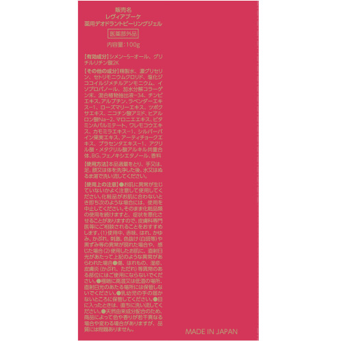 <レヴィアブーケ>より、有効成分シメン-5-オール、グリチルリチン酸2Kを配合し、皮膚の清浄・殺菌・消毒、体臭・汗臭及びにきびを防ぐ効能効果のある薬用デオドラントピーリングジェル×3のセットです。