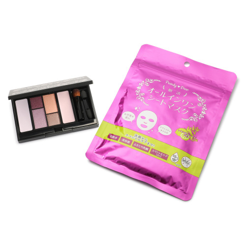 <パーリーデュー>より、アイシャドウ4色、アイシャドウベース2色の合計6色入りで、シーンや洋服に合わせ、さまざまなスタイルをお楽しみいただけるメイクパレット、朝起きた後お顔にシートマスクを乗せ、お肌を柔らかくして拭き取ることで古い角質除去・洗顔・化粧水・美容液までを担うオールインワンシートマスクの5枚入り、カラーチャートのセットです。