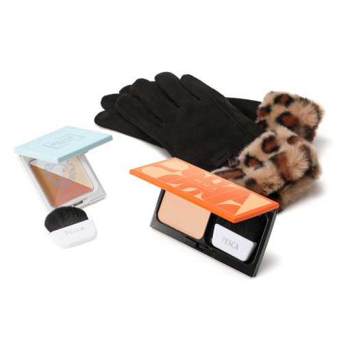あれ性)の効能効果のあるSPF50+、PA++++の薬用シワ改善美容液ファンデーションと、立体感とつややかで若々しい印象を演出するフェイスパウダー、手袋のセットです。