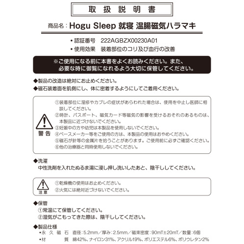 装着部位のこり及び血行の改善の効果がある管理医療機器「ホグスリープ メディカル磁気温腸ハラマキ(温腸磁気ハラマキ)」です。