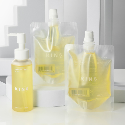 <KINS>より、メイクや毛穴汚れなどをするんと落とす、ダブル洗顔不要のクレンジングオイルとそのレフィル(詰替え用)×2のセットです。